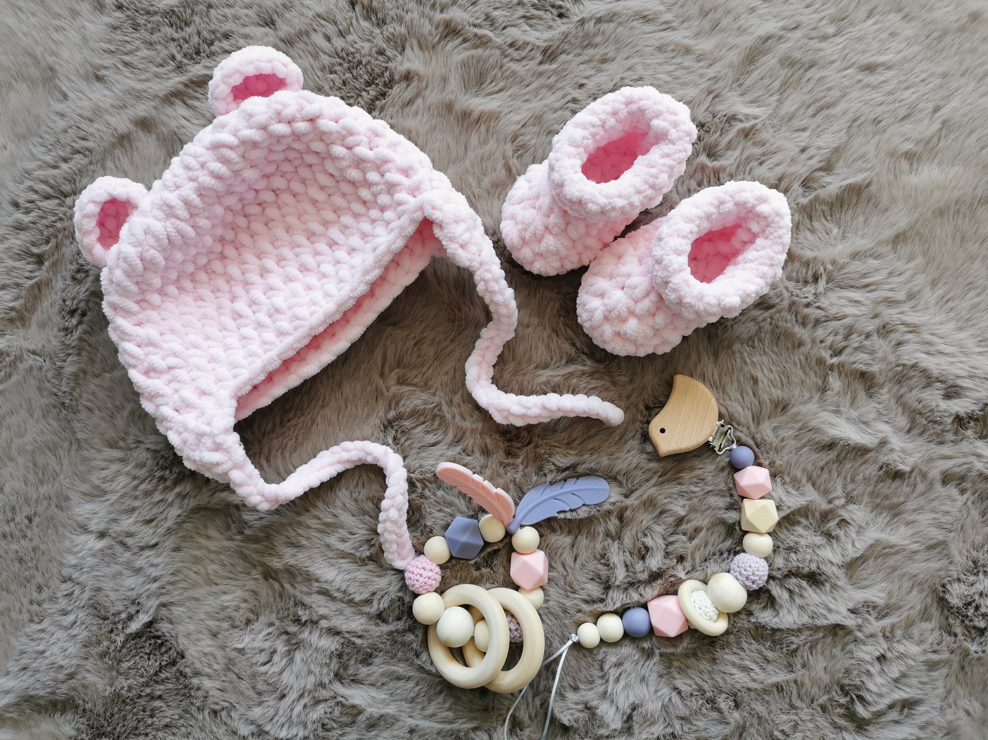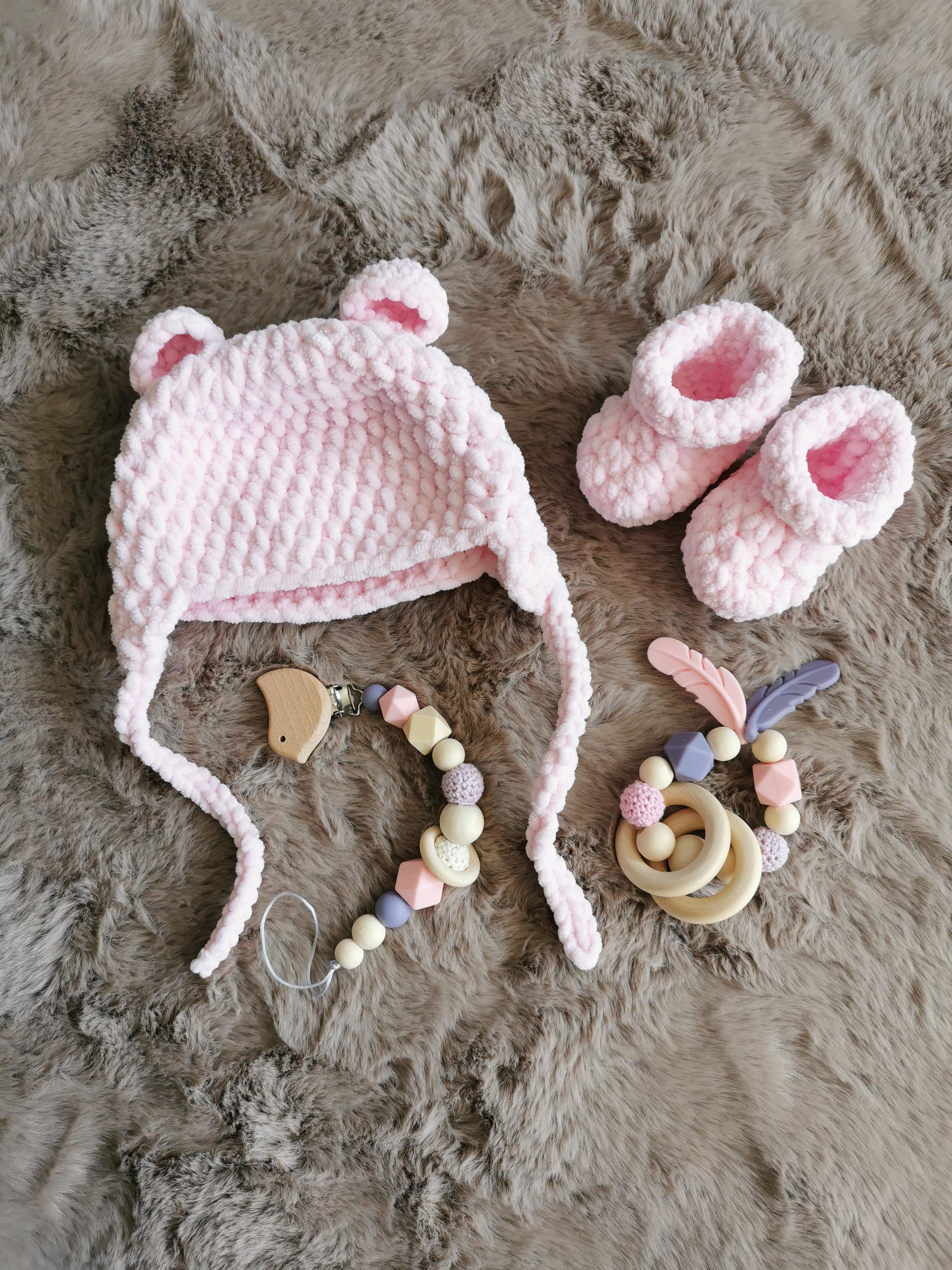 This gorgeous handmade baby set is the perfect present for your precious little one! Soft to the touch and gentle on delicate skin, it’s designed to bring comfort, warmth, and a smile to every cuddle.