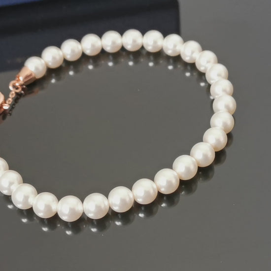 Showcasing clean lines and a minimalistic silhouette, this chic friendship bracelet is a tribute to classic British style. Measuring 7.25 inches in length, it features lustrous white Swarovski Pearls (6.5–7.5mm) that glow with soft elegance, strung along a delicate chain finished with an adjustable clasp plated in 18k rose gold.